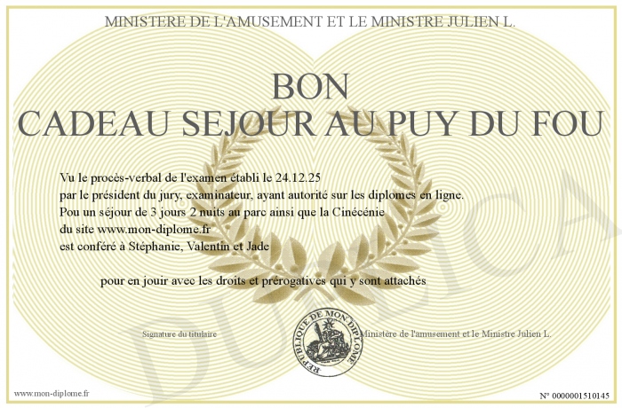 Envoyez par email votre Bon Cadeau Séjour au Puy Du Fou personalisé