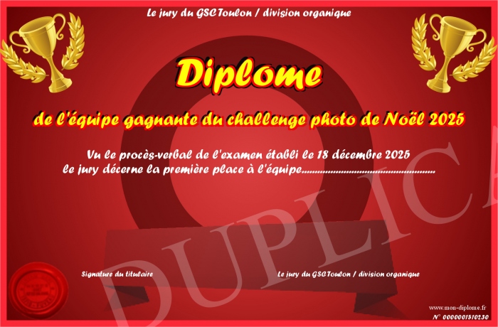 Envoyez par email votre Diplôme de l'équipe gagnante du challenge photo de Noël 2025 personalisé