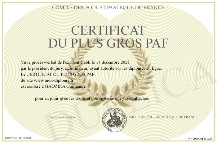 Envoyez par email votre CERTIFICAT DU PLUS GROS PAF personalisé