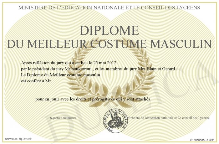 Envoyez par email votre Diplome du Meilleur costume masculin personalisé