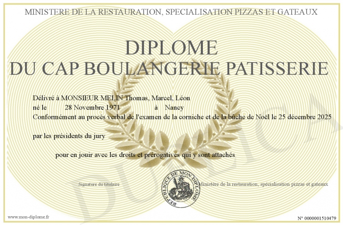 Envoyez par email votre Diplôme du CAP BOULANGERIE PATISSERIE personalisé