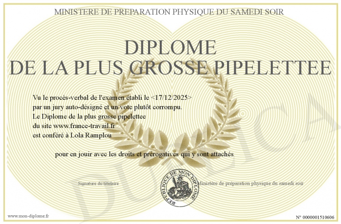 Envoyez par email votre Diplôme de la plus grosse pipelettee personalisé