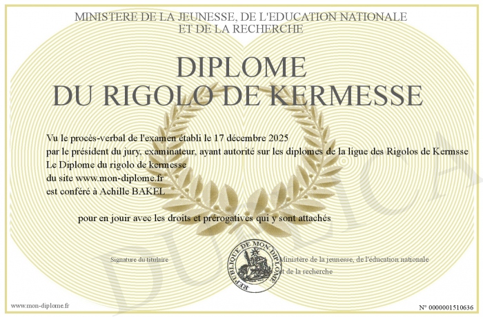 Envoyez par email votre Diplôme du rigolo de kermesse personalisé