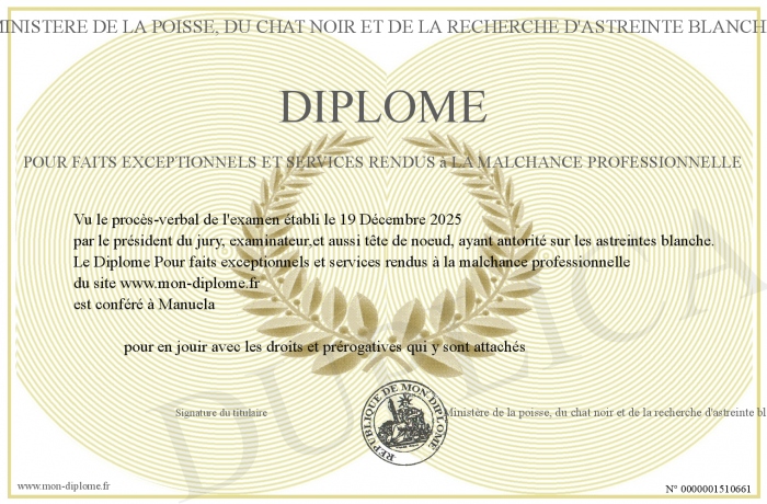 Envoyez par email votre Diplôme Pour faits exceptionnels et services rendus à la malchance professionnelle personalisé