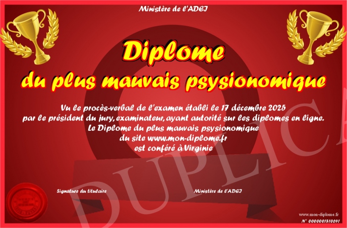 Envoyez par email votre Diplôme du plus mauvais psysionomique personalisé