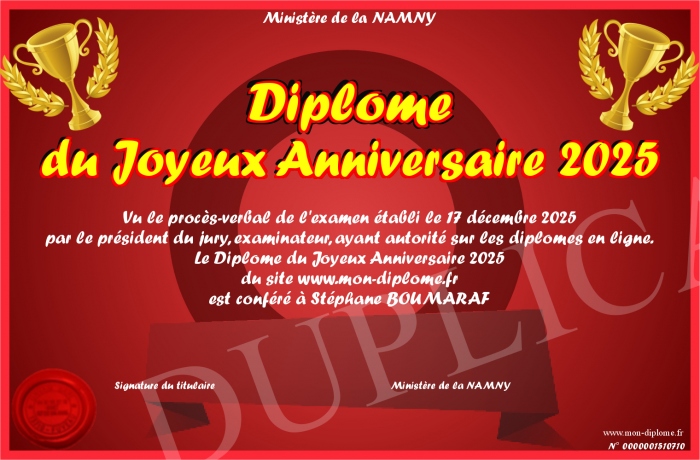 Envoyez par email votre Diplôme du Joyeux Anniversaire 2025 personalisé