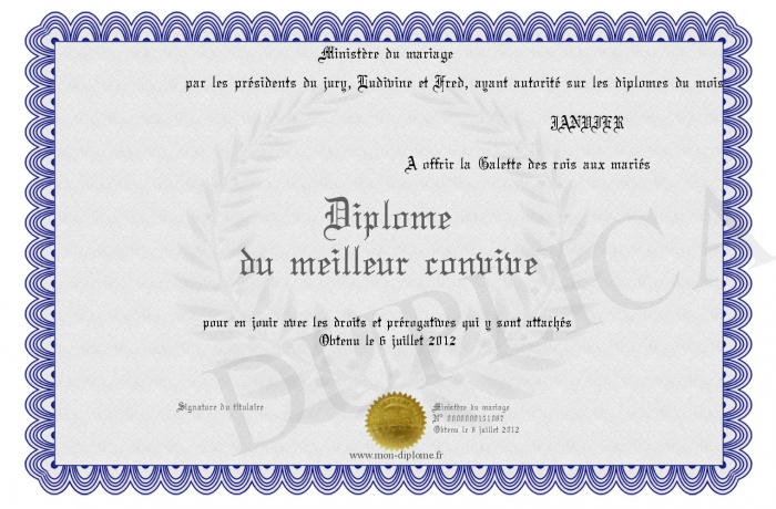 Envoyez par email votre Diplome du meilleur convive personalisé