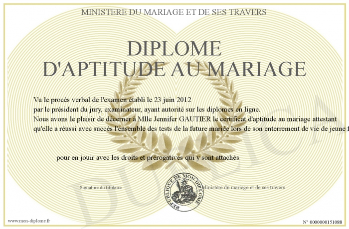 Envoyez par email votre Diplôme d'aptitude au mariage personalisé