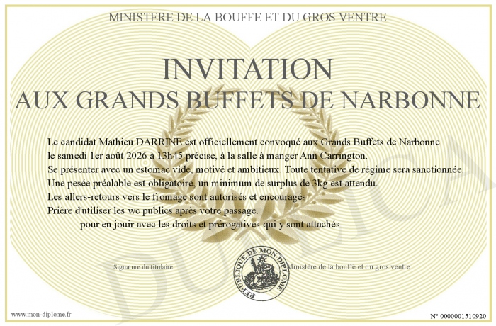 Envoyez par email votre Invitation aux Grands Buffets de Narbonne personalisé