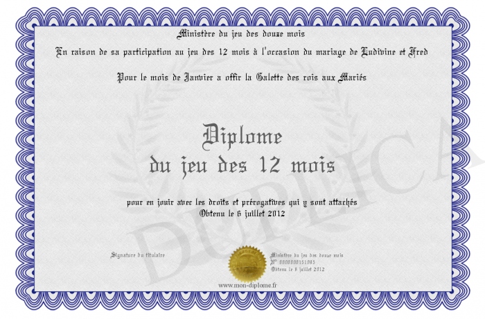 Envoyez par email votre Diplôme du jeu des 12 mois personalisé