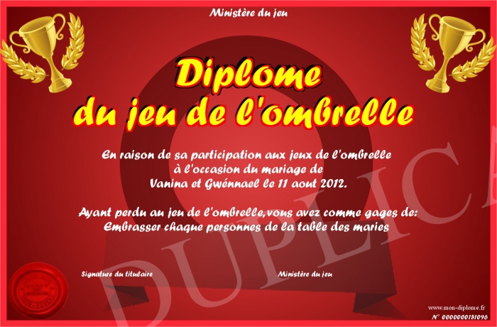 Envoyez par email votre Diplôme du jeu de l'ombrelle personalisé