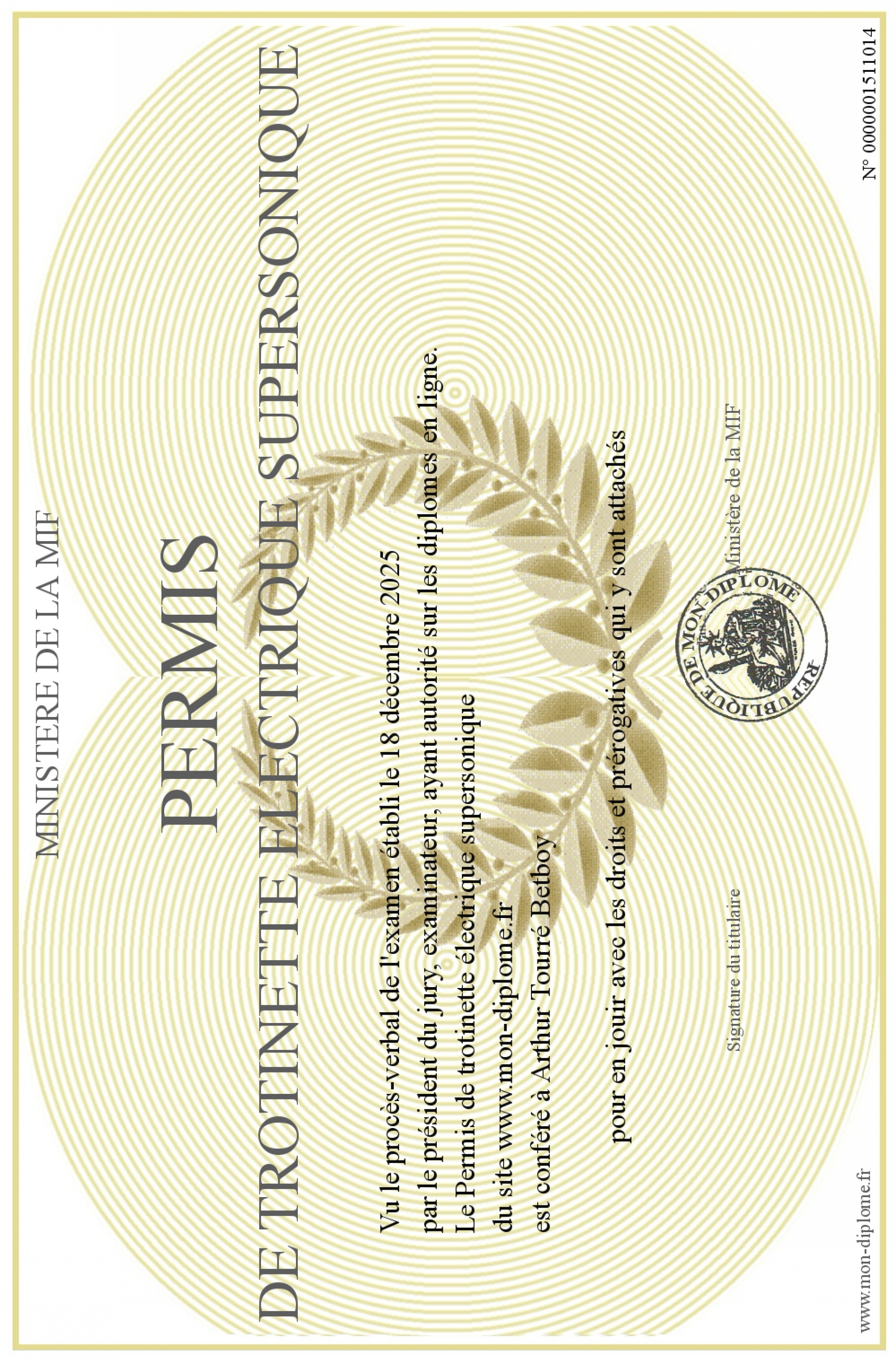 Envoyez par email votre Permis de trotinette électrique supersonique personalisé