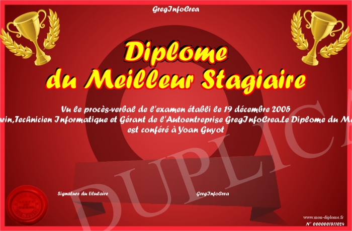 Envoyez par email votre Diplôme du Meilleur Stagiaire personalisé