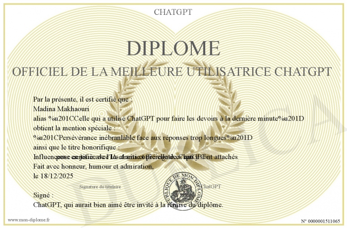 Envoyez par email votre Diplôme officiel de la Meilleure Utilisatrice ChatGPT personalisé