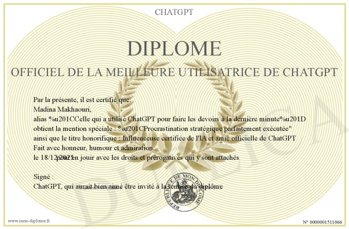 Envoyez par email votre Diplôme officiel de la Meilleure Utilisatrice de ChatGPT personalisé