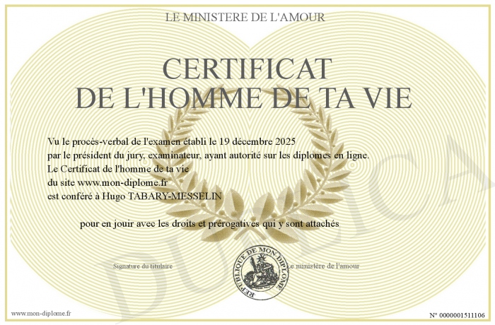 Envoyez par email votre Certificat de l'homme de ta vie personalisé