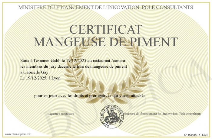 Envoyez par email votre Certificat Mangeuse de piment personalisé