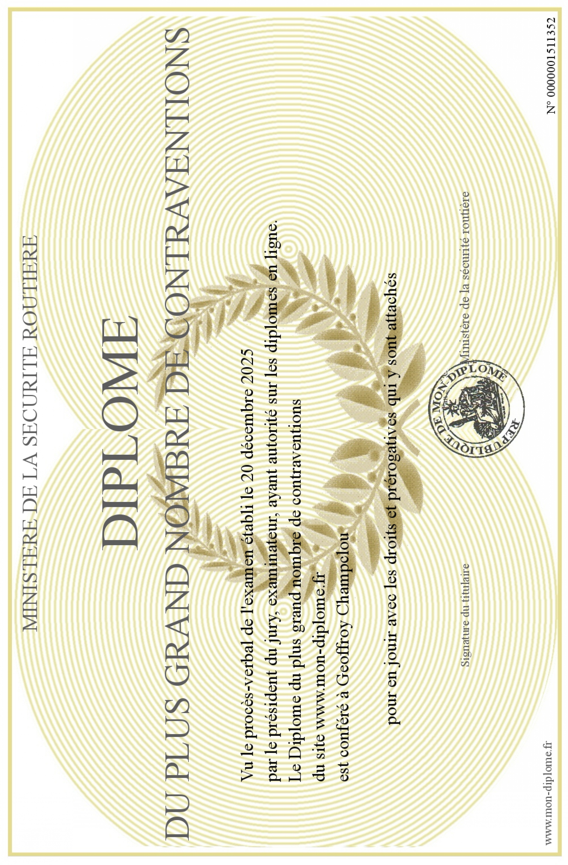 Envoyez par email votre Diplôme du plus grand nombre de contraventions personalisé