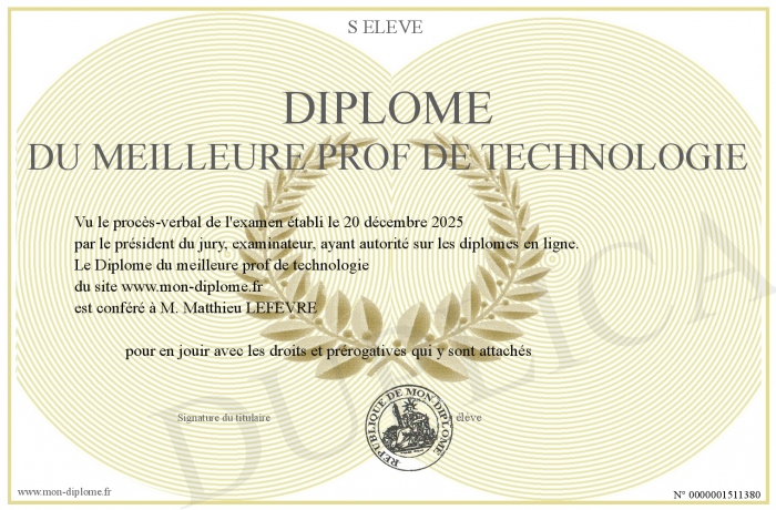 Envoyez par email votre Diplôme du meilleure prof de technologie personalisé