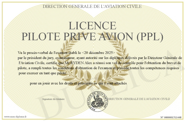Envoyez par email votre LICENCE PILOTE PRIVE AVION (PPL) personalisé