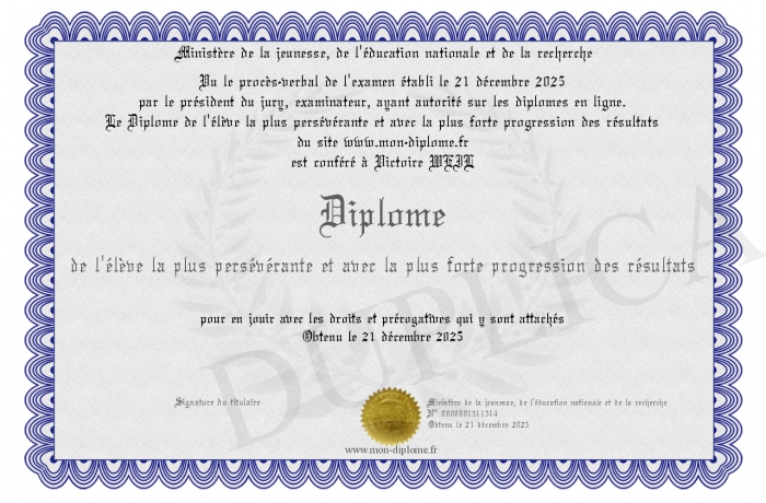 Envoyez par email votre Diplôme de l'élève la plus persévérante et avec la plus forte progression des résultats personalisé