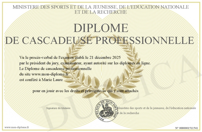 Envoyez par email votre Diplôme de cascadeuse professionnelle personalisé