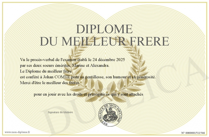 Envoyez par email votre Diplôme du meilleur frère personalisé