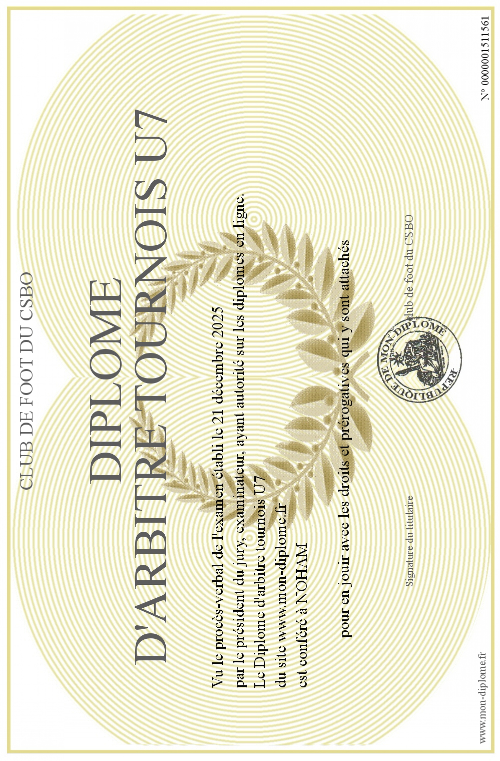 Envoyez par email votre Diplôme d'arbitre tournois U7 personalisé