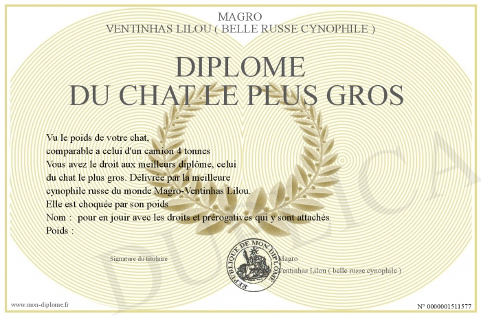 Envoyez par email votre Diplôme du chat le plus gros personalisé