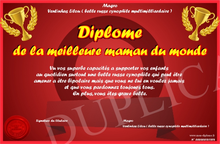 Envoyez par email votre Diplôme de la meilleure maman du monde personalisé