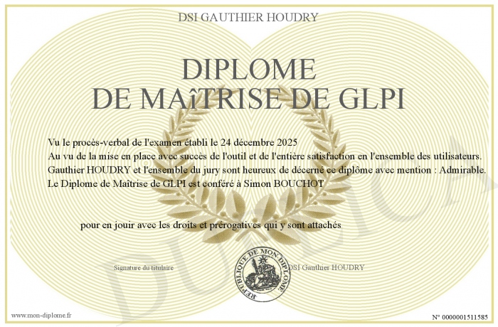 Envoyez par email votre Diplôme de Maîtrise de GLPI personalisé