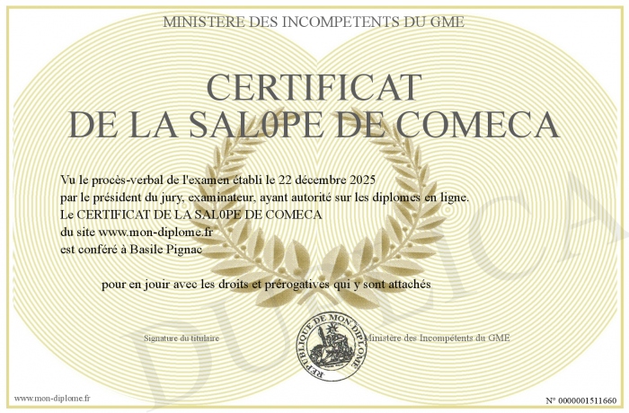Envoyez par email votre CERTIFICAT DE LA SAL0PE DE COMECA personalisé
