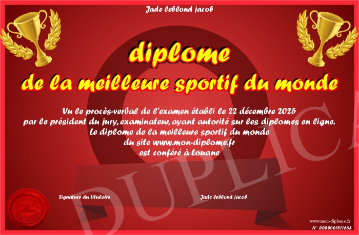 Envoyez par email votre diplome de la meilleure sportif du monde personalisé
