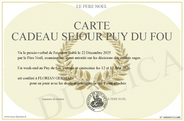 Envoyez par email votre CARTE CADEAU SEJOUR PUY DU FOU personalisé