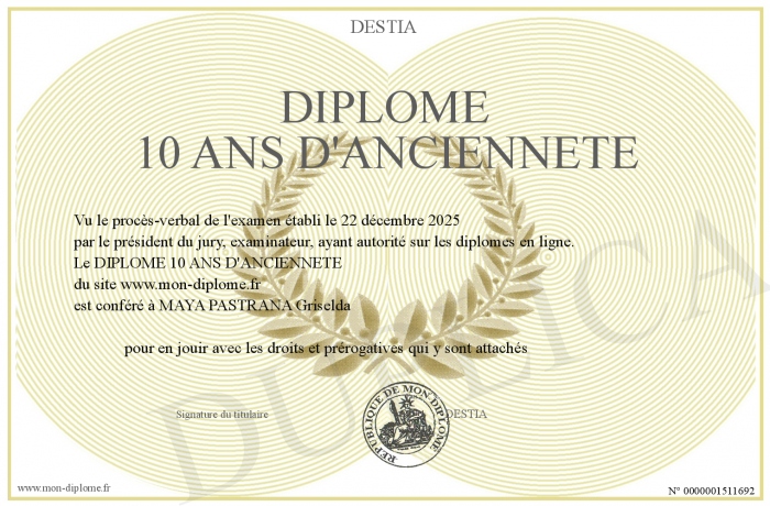 Envoyez par email votre DIPLOME 10 ANS D'ANCIENNETE personalisé