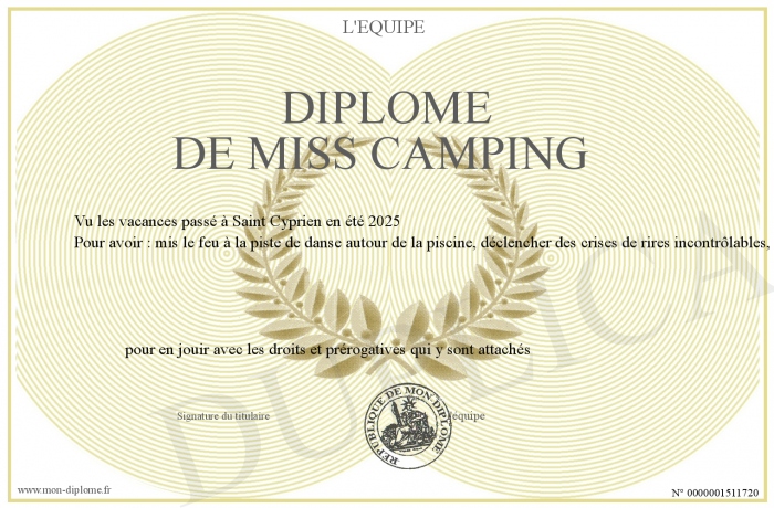 Envoyez par email votre Diplôme de miss camping personalisé
