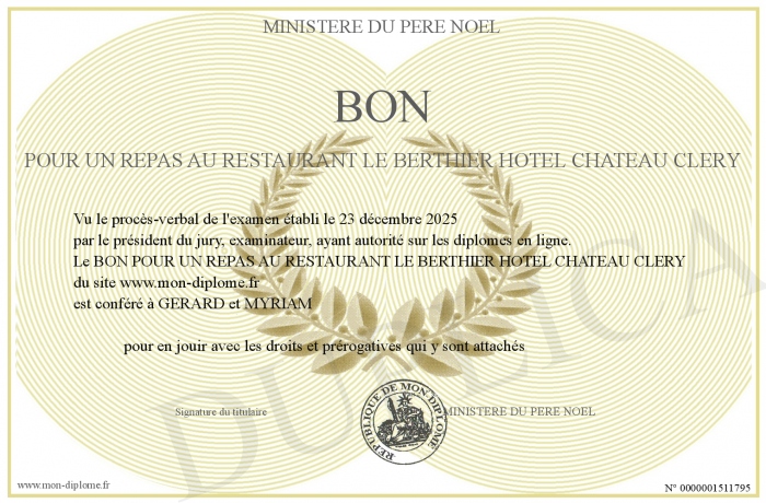 Envoyez par email votre BON POUR UN REPAS AU RESTAURANT LE BERTHIER HOTEL CHATEAU CLERY personalisé