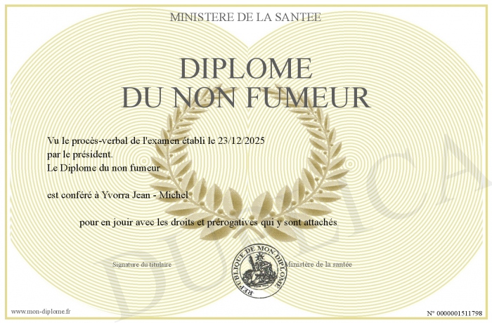 Envoyez par email votre Diplôme du non fumeur personalisé