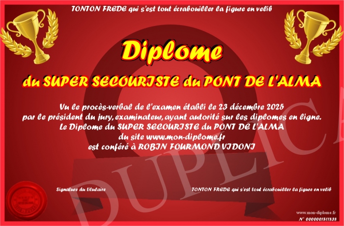 Envoyez par email votre Diplôme du SUPER SECOURISTE du PONT DE L'ALMA personalisé