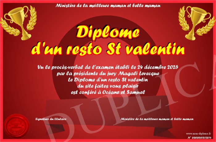 Envoyez par email votre Diplôme d'un resto St valentin personalisé