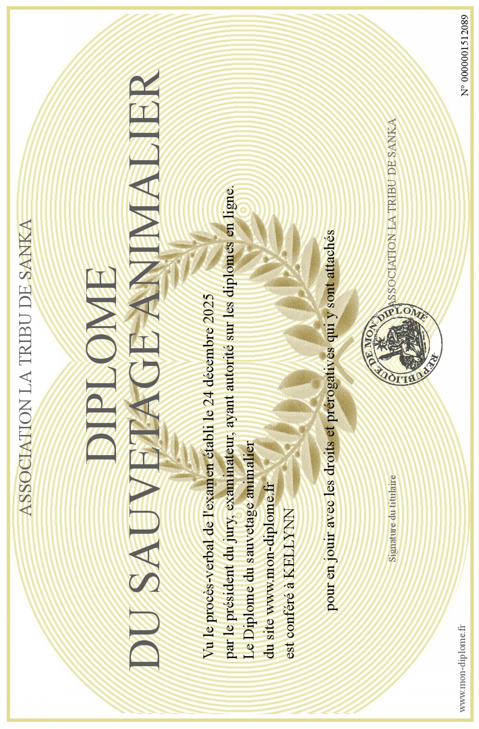 Envoyez par email votre Diplôme du sauvetage animalier personalisé