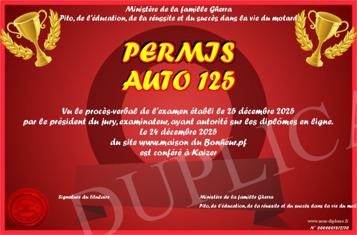 Envoyez par email votre PERMIS AUTO 125 personalisé