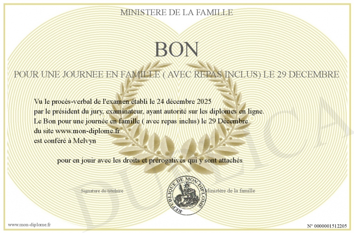 Envoyez par email votre Bon pour une journée en famille ( avec repas inclus) le 29 Décembre personalisé