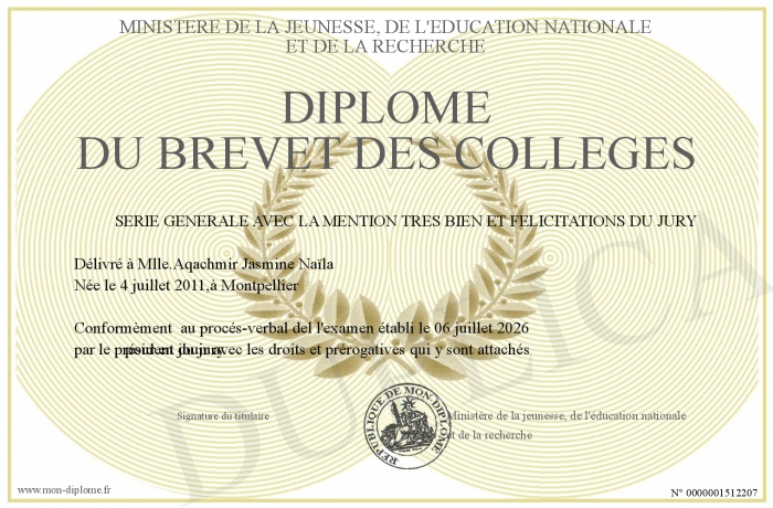 Envoyez par email votre Diplôme DU BREVET DES COLLEGES personalisé