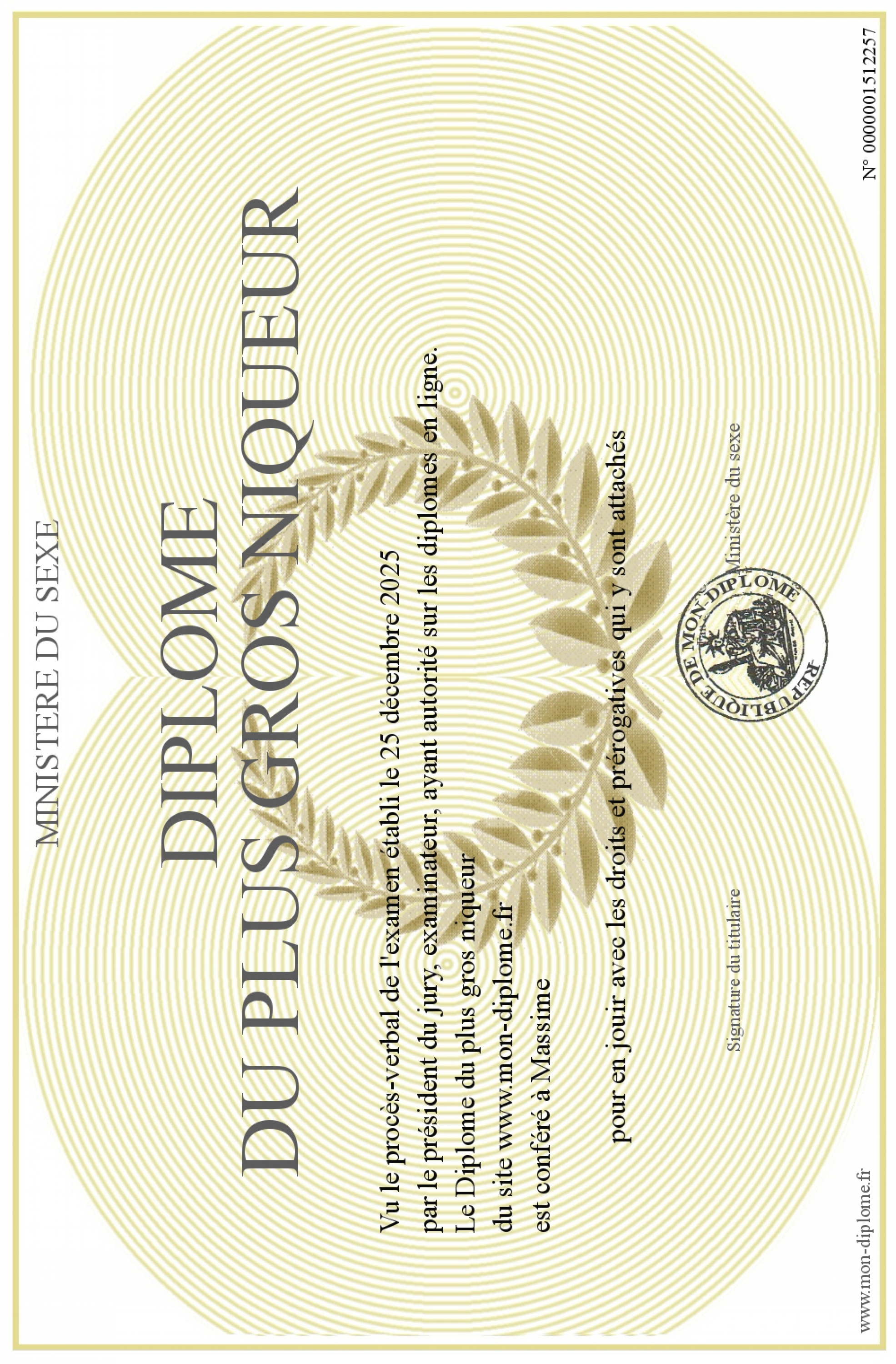 Envoyez par email votre Diplôme du plus gros niqueur personalisé