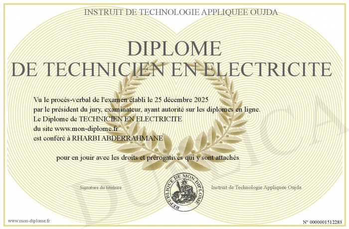Envoyez par email votre Diplôme de TECHNICIEN EN ELECTRICITE personalisé