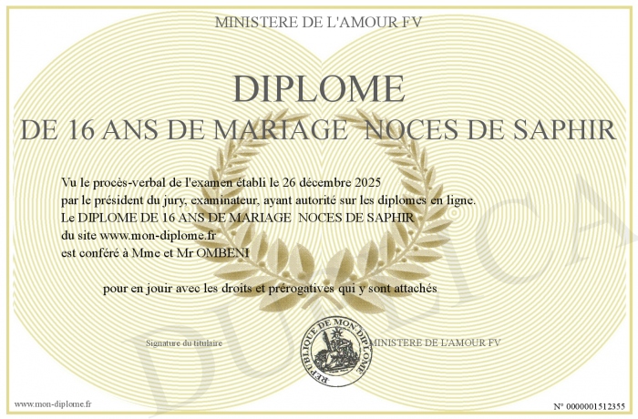 Envoyez par email votre DIPLOME DE 16 ANS DE MARIAGE NOCES DE SAPHIR personalisé