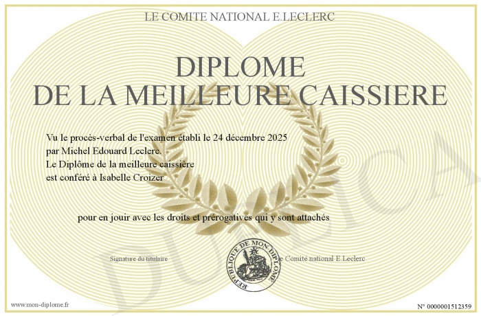 Envoyez par email votre Diplôme de la meilleure caissière personalisé
