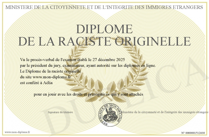 Envoyez par email votre Diplôme de la raciste originelle personalisé