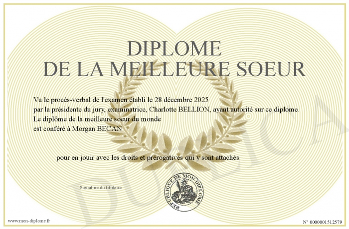Envoyez par email votre Diplôme de la meilleure soeur personalisé